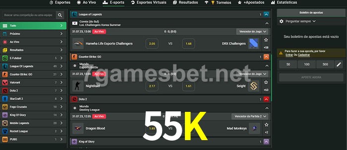 A aposta 55K oferece aos jogadores a experiência mais conveniente de apostas em eSports!
